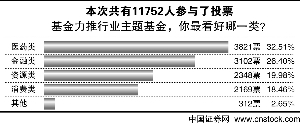 上周,中国证券网进行了“基金力推行业主题基金,你最看好哪一类?”的互动调查,结果显示,有3821名网友投票选择“医药类”,选择该选项人数占所有投票人数的32.51%,有3102名网友投票选择“金融类”,占所有投票人数的26.40%,2348人投票选择了“资源类”,占所有投票人数的19.98%,有2169名投票者选择了“消费类”,占所有投票人数的18.46%,此外,还有312人选择了“其他”,选择该选项的人数占所有投票总人数的2.65%。