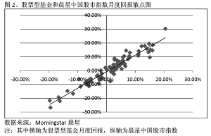 从股票型基金和晨星中国股市指数月度回报的散点图可以看到,两者是高度的正相关关系,反映出股票型基金以获取相对收益为目的的风险收益特征。