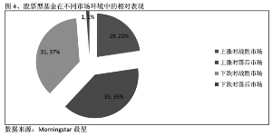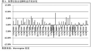股票型基金在长期表现中大幅领先市场,其取胜的秘诀是什么?我们以月度回报数据为基础,自2003年6月1日到2010年6月30日的84个自然月度回报中,股票型基金共有50个月度表现战胜市场,战胜比率约为60%。值得注意的是,在市场出现上涨的52个月份中,只有19个月份股票型基金战胜市场,战胜率为36.5%;而在市场下跌的32个月份中,有31个月战胜市场,战胜率达到96%。这里给了投资者一个非常重要的提示,在下跌行情中跌幅更小是股票型基金长期大幅领先市场的重要原因。从这个角度看投资更像是一个“看谁不赔钱”的游戏,只要能尽可能的保住本金,翻身就是一件不太困难的任务。股票型基金落后市场最大的时点出现在2007年4月,当月晨星中国股市指数上涨了30.25%,股票型基金只上涨了20.47%落后指数9.78%;但在2007年6月份,市场在牛市高点出现了回调下跌7.74%,同期的股票型基金上涨了1.36%。股票型基金能够在市场下跌时更明显战胜市场,仓位调整很可能是最重要的因素之一。相对而言,中国主动型基金通常会在市场下跌中下调股票仓位来回避系统风险。