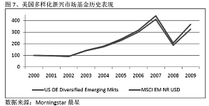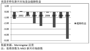 美国多样化新兴市场基金的相对表现同样未能给投资者带来惊喜。自2001年初到2009年末,MSCI新兴市场指数涨幅为367.6%,同期多样化新兴市场基金的涨幅为325.7%,同样落后于指数的表现。细数单个年份的表现,9个完整的自然年份中多样化新兴市场基金仅在2002年略微超越基准指数,其余8年均落后指数,包括在2008年和2009年的单边市场均较大幅度落后基准指数。