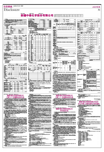 新疆中泰化学股份有限公司2010年半年度报告摘要