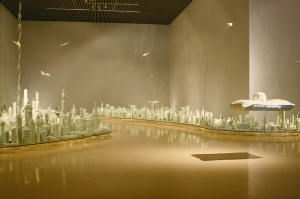 这次的《日常·易碎——浦江两岸》,就是刘建华以上海外滩两岸的风景为基本原型特地创作。所有进入展厅的观众沿着原型为黄浦江的参观通道,领略刘建华用各种青白瓷器翻制的日常用品所拼建出的上海独特的城市风景:靴子与奶瓶组成的高楼、肥皂铺就的大道、花菜绿地等。这座陶瓷城市被悬置在离地7厘米的玻璃上,突显城市的单调与空虚;空中悬浮的坦克与飞机,暗示着繁华背后的危机;而那从天空垂至地面的众多“奥特曼”则提醒着外来文化的入侵。展览呈现的是一个繁华美丽的都市梦。整个展厅便是一个梦的现场,入口处一个低悬的枕头,上面摆放着哲学化的骷髅形象,寓意着所有的一切都从这里出发,抑或所有的一切都只是黄梁一梦。