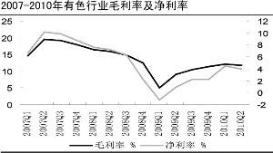 总体看,2010年有色行业的盈利能力不断提升。有色行业毛利率目前整体为11.83%,相比一季度的高点12.19%略有下降,但总体维持在较高的水平。净利率目前为4.0%,较一季度的4.52%略为下降,但仍然在较高水平。