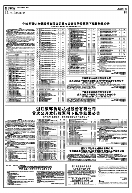 宁波圣莱达电器股份有限公司首次公开发行股票网下配售结果公告