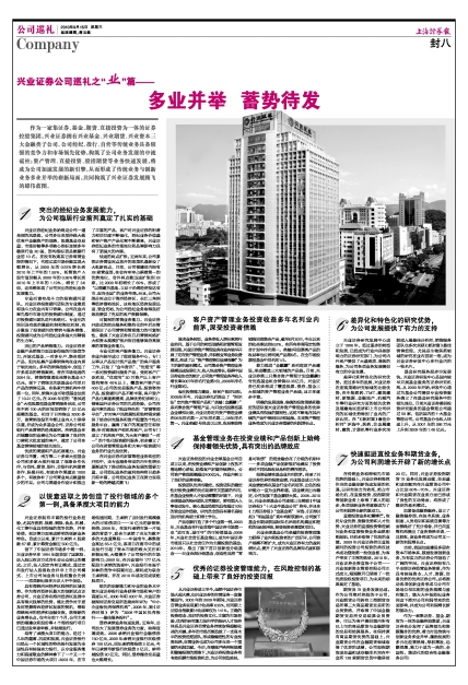 作为一家集证券、基金、期货、直接投资为一体的证券控股集团,兴业证券拥有兴业基金、兴业期货、兴业资本三大金融类子公司。公司经纪、投行、自营等传统业务具备较强的竞争力和市场领先优势,构筑了公司业务发展的中流砥柱;资产管理、直接投资、股指期货等业务快速发展,将成为公司加速发展的新引擎,从而形成了传统业务与创新业务多业并举的崭新局面,共同构筑了兴业证券发展腾飞的雄伟蓝图。