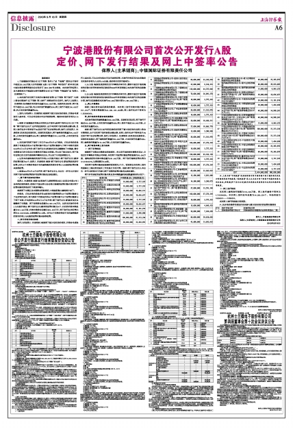 4、根据《宁波港股份有限公司首次公开发行A股网下发行公告》(以下简称“《网下发行公告》”)公布的回拨机制,由于本次网下发行获得足额认购,且网上发行初步中签率低于3%且低于网下初步配售比例,发行人和保荐人(主承销商)决定启动回拨机制。回拨机制实施后,网下最终发行数量为90,000万股,占本次发行总量的45%;网上最终发行数量为110,000万股,占本次发行总量的55%。