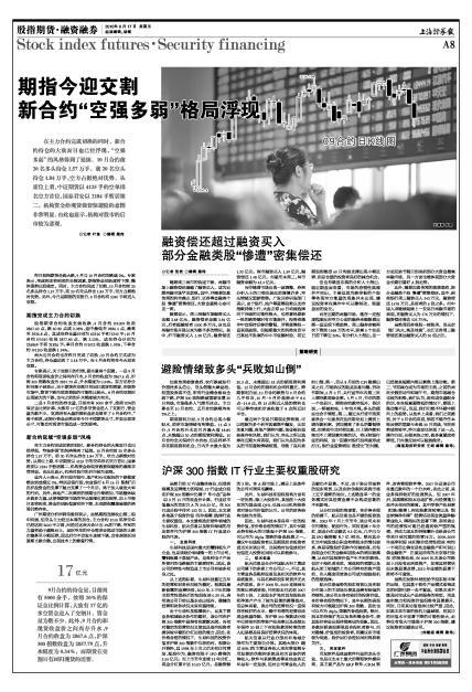 昨日股指期货全线大跌,9月与10月合约均跌逾2%。专家表示,考虑到即将到来的长假因素,期指资金活跃度将下降,整体弱势已经奠定。同时,主力合约完成了切换,10月合约前20名多头持仓1.57万手,前20名空头持仓1.84万手,空方占据绝对优势。另外,今日是期指的交割日,9月合约有5240手将进入交割。