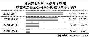 上周,中国证券网进行了“您在挑选基金公司品牌时较倾向于哪类”的网络互动调查。结果显示,有2931名网友投票选择了“业绩突出的”选项,选择该选项的网友占所有参与投票总人数的42.63%;同时,有2418名网友投票选择了“产品有特色的”选项,选择该选项的网友占所有参与投票总人数的35.17%;有1070名网友投票选择了“风控能力强的”选项,选择该选项的网友占所有参与投票总人数的15.56%;456名网友投票选择了“明星基金经理多的”选项,选择该选项的网友占所有参与投票总人数的6.63%。