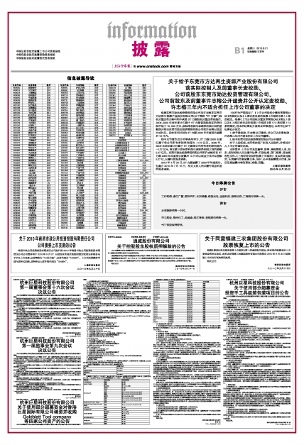 | 证券代码 | 证券简称 | 版序 | | 002173 | 山下湖 | B32 | | 002205 | 国统股份 | B34 | | 002281 | 光迅科技 | B40 | | 002301 | 齐心文具 | B25 | | 002305 | 南国置业 | B34 | | 002328 | 新朋股份 | B48 | | 002329 | 皇氏乳业 | B38 | | 002364 | 中恒电气 | B18 | | 002377 | 国创高新 | B25 | | 002396 | 星网锐捷 | B32 | | 002398 | 建研集团 | B31 | | 002438 | 江苏神通 | B34 | | 002439 | 启明星辰 | B34 | | 002444 | 巨星科技 | B1 | | 002463 | 沪电股份 | B48 | | 002464 | 金利科技 | B31 | | 002470 | 金正大 | B33 | | 002472 | 双环传动 | B32 | | 002473 | 圣莱达 | B34 | | 200771 | 杭汽轮B | B12 |