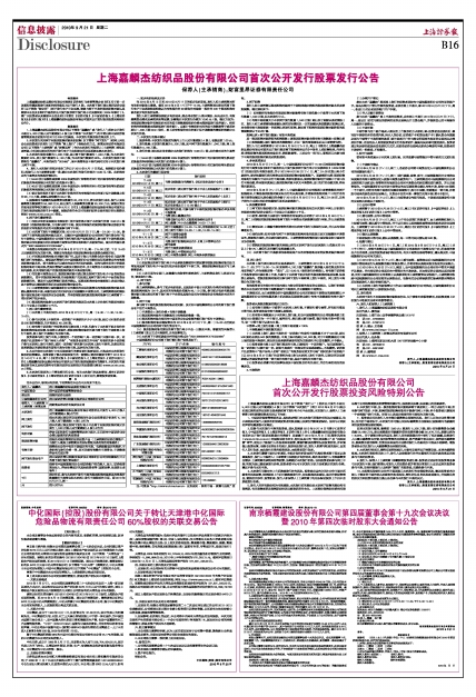 上海嘉麟杰纺织品股份有限公司首次公开发行股票发行公告