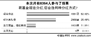 上周,中国证券网进行了“若基金现在分红,您会选何种分红方式”的网络互动调查。结果显示,有4384名网友投票选择了“现金分红”的方式,占所有参与投票总人数的52.42%;有2968名网友投票选择了“红利再投资”的方式,占所有参与投票总人数的35.49%;此外,还有1003名网友投票选择了“先拿现金,择机再投”的方式,占所有参与投票总人数的11.99%;仅有9人投票选择对分红“从不关心”,占比0.11%。