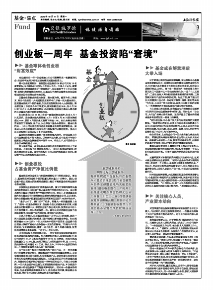 在创业板开启一周年之际,创业板的财富效应或许现在只有产业资本才能切实体会,而代表金融资本的基金却尴尬地陷入被套的窘境,创业板个股在一年时间中的低迷表现令基金经理无法从中分羹。但另一方面,投资创业板对基金影响甚微。根据不完全数据显示,目前创业板股票占全部公募基金资产净值比例远远低于2%。