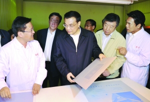 8日至9日,国务院副总理李克强在出席南水北调工程建设工作座谈会期间,到中线工程渠首所在地河南省南阳市,就经济社会发展情况进行考察调研。他强调,要加快转变经济发展方式,扎实推进工业化、城镇化和农业现代化,增强发展后劲和优势,提升发展质量和水平。图为李克强在乐凯集团考察数码印版生产线。新华社 图