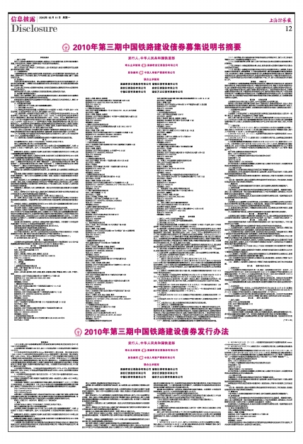 十二、公告日:发行首日前的第4个工作日,即2010年10月9日,发行人于当日公告《2010年第三期中国铁路建设债券募集说明书》、《2010年第三期中国铁路建设债券募集说明书摘要》、《2010年第三期中国铁路建设债券发行办法》、中诚信国际信用评级有限责任公司为本期债券出具的信用评级报告、北京市鑫河律师事务所为本期债券出具的法律意见书等有关文件。