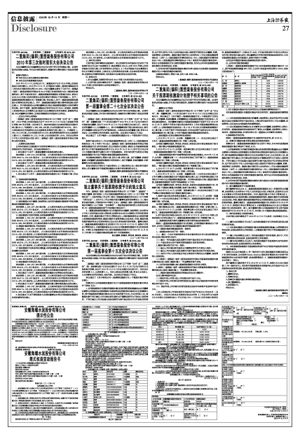二重集团(德阳)重型装备股份有限公司(以下简称“公司”或“本公司”)第一届董事会第二十七次会议通知于2010年9月28日以电子邮件方式发给各位董事,会议于2010年10月8日在公司第五会议室召开。本次会议应到董事9人,出席董事9人。其中许斌董事因故不能出席本次会议,委托罗元福董事出席会议并代为行使表决权。出席本次会议的董事人数,符合《公司法》、《公司章程》的有关规定,合法有效。会议审议并通过以下决议: