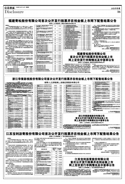 福建青松股份有限公司于2010年10月12日利用深圳证券交易所交易系统网上定价发行“青松股份”A股1,360万股,保荐人(主承销商)国金证券股份有限公司根据深圳证券交易所提供的数据,对本次网上定价发行的申购情况进行了统计,并经中审国际会计师事务所有限公司验证,本次网上定价发行有效申购户数为205,324户,有效申购股数为1,337,285,000股,配号总数为2,674,570个,起始号码为000000000001,截止号码为000002674570。