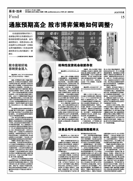 袁航:10月份CPI高达4.4%,大大超出市场预期;随后,国家信息中心11月19日发布报告预计四季度CPI涨幅将达到3.8%,全年CPI涨幅将会略超3%的调控目标。预计未来通胀仍将在高位运行。同时国家宏观调控政策在“保增长、防通胀、调结构”之间进行有选择性的取舍,周期性行业面临的机会相对较少,预期结构性行情仍将演绎。在此背景下,抗通胀板块将会持续受到市场关注,如医药、农业、食品饮料、商业零售等行业。