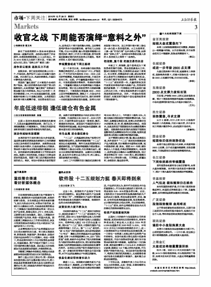 淡化了加息预期的A股本来有望在本周迎来一波像样反弹,战争阴云粉碎了所有期待,全周股指宽幅振荡,让人无所适从。作为2010年收关之战的下周市场,平淡已然成为共识,那么“意料之外”能否上演?