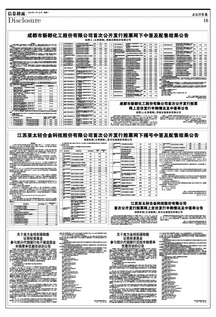 6、根据2011年1月5日公布的《成都市新都化工股份有限公司首次公开发行股票发行公告》(以下简称“《发行公告》”),本公告一经刊出即视同已向参加网下申购获得配售的所有配售对象送达了获配通知。