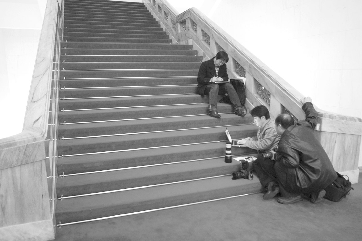 记者们奋战的身影成为会场内外一道别样的风景线,就地写稿、发稿随处可见。