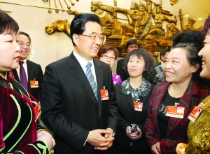3月8日,中共中央总书记、国家主席、中央军委主席胡锦涛参加十一届全国人大四次会议内蒙古代表团的审议。图为胡锦涛来到女代表中间,同她们亲切交谈,代表党中央向出席两会的女代表、女委员,向全国各族各界妇女同胞致以节日的祝贺和诚挚的问候。新华社 图