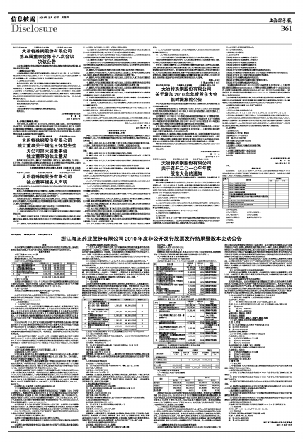 浙江海正药业股份有限公司2010年度非公开发行股票发行结果暨股本变动公告