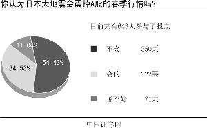 正当A股的春季行情方兴未艾之际,日本爆发大地震,在“日本大地震会否震掉A股的春季行情”的调查中,半数以上网友持乐观态度,认为大地震不会震掉A股的春季行情;三成多网友则悲观地认为地震会震掉A股的春季行情;另有一成多网友则持“说不好”的观望态度。