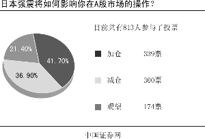 日本大地震发生后,A股投资者的操作将受怎样的影响?中国证券网调查显示,超过四成的网友选择了“加仓”操作,观望者占去两成,另有三成网友选择“减仓”。