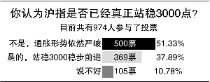 中国证券网最新调查显示,几番上下之后,半数以上的网友认为沪指已经真正站稳3000点,接下来将会稳步前进;三成多的网友则认为通胀形势依然严峻,大盘并未站稳3000点;另有一成多网友选择了“说不好”。