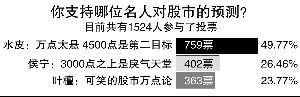 日前“股市万点论”重出江湖,引发热议。不少位名人也对此发表看法。中国证券网调查显示,近半数的网友赞同水皮的观点,认为“万点太悬,4500点是第二目标”;两成多的网友更支持侯宁的观点,觉得“3000点之上是戾气天堂 ”;另有两成多的网友则与叶檀持相同意见,觉得“股市万点论”相当可笑。