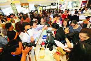 10时15分左右,雅诗兰黛专柜的套装产品已经被抢购得所剩无几。10时30分,古驰(Gucci)专卖店门前由于人数太多限制进入。店方规定,同时进入店内的购买者不得超过20人。上图为三亚免税店日化区的收银台被顾客围得水泄不通。 相关报道详见封三 本报传真图
