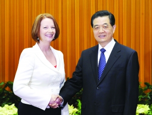 胡锦涛积极评价吉拉德就任以来奉行务实友好、互利合作的对华关系,表示中澳双方应共同落实好两国高层互访成果,进一步做好以下三方面工作:一是相互尊重,深化政治互信。双方要妥善处理两国间的敏感问题,牢牢把握两国关系发展大方向,使中澳关系始终沿着健康稳定的轨道发展。二是互利合作,实现共同发展。双方要充分发挥互补优势,将巨大的合作潜力转化为实实在在的合作成果,提升各领域务实合作水平。三是加强对话,扩大多边合作。双方要加强在区域、二十国集团机制、应对全球性挑战等国际和地区事务中的沟通与协调,为促进亚太地区乃至世界的和平、稳定与发展而共同努力,推动中澳关系向更高层次、更广领域迈进。 新华社 图
