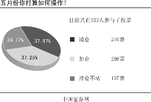 网上调查显示,进入五月份后,仅有三成多网友准备加仓,而打算减仓的网友也占去三成多,另外两成网友选择“持仓不动”。