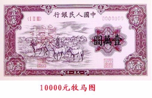 一版人民币于1948年12月1日开始发行,1955年停止流通,存世稀少,所以一些特殊纸币上涨惊人。2010年12月,在上海举行的泓盛2010年秋季邮票钱币拍卖会上,1951年期间在内蒙古地区发行的一枚“牧马图”壹万圆面额人民币,最后以创纪录的230万元刷新中国纸钞成交的世界记录,成为“中国纸币之王”。
