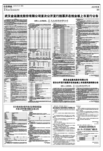 武汉金运激光股份有限公司首次公开发行股票并在创业板上市发行公告