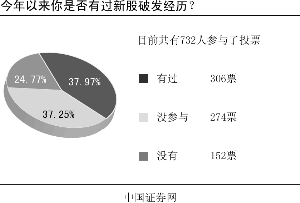中国证券网最新调查显示,超过四成网友有过新股破发经历,仅有两成网友没有经历过破发,另外三成多的网友表示没参与过新股买卖。