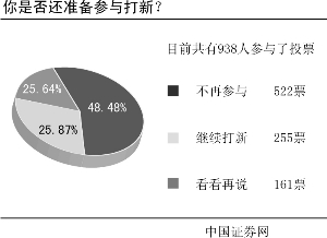 新股破发现象频繁出现,你是否还准备参与打新?中国证券网最新调查显示,超过半数以上的网友表示今后不再参与打新,仅两成多的网友表示还会继续打新,另外一成多的网友则表示看看再说。