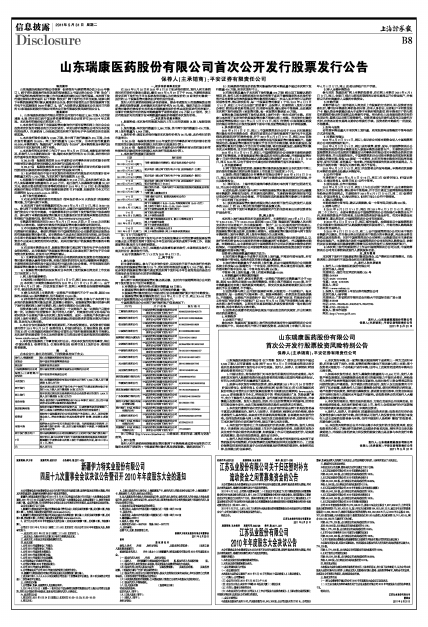 山东瑞康医药股份有限公司首次公开发行股票发行公告