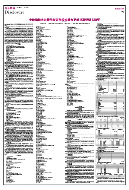 本摘要根据《中欧稳健收益债券型证券投资基金基金合同》和《中欧稳健收益债券型证券投资基金更新招募说明书》编写,并经中国证监会核准。基金合同是约定基金当事人之间权利、义务的法律文件。基金投资人自依基金合同取得基金份额,即成为基金份额持有人和本基金合同的当事人,其持有基金份额的行为本身即表明其对基金合同的承认和接受,并按照《基金法》、《运作办法》、基金合同及其他有关规定享有权利、承担义务。基金投资人欲了解基金份额持有人的权利和义务,应详细查阅基金合同。