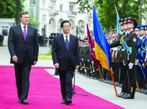 图为胡锦涛主席在亚努科维奇总统的陪同下检阅仪仗队。新华社 图