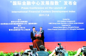 8日,2011年度“新华-道琼斯国际金融中心发展指数”在上海发布。在充分体现过去一年世界形势变化对国际金融中心发展影响的情况下,纽约、伦敦与东京继续领跑国际金融中心城市发展实力前三甲,而中国上海则由上一年度排名全球第八位上升至第六位。图为“国际金融中心发展指数”发布会现场 新华社图