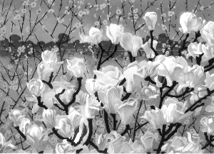 张德宝的水印版画既有亮丽的水彩色彩;又充满固有的海派风格以及浓重的异国情调。他的花卉版画不采用油画颜料套色,而选用传统的木刻水印。荣获“江南之春”美展一等奖的《幽香》是张德宝的得意之作——浓重的暗调子背景下,隐约撇出几片兰叶,修长花瓣错落有致,三束暖色花蕊的点缀,扭转了画面冷调子的一统,构图、色彩处理得既传统又抽象,极富当代性。
