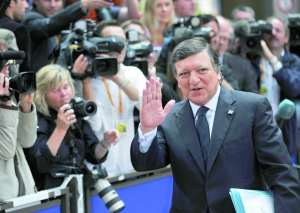 7月21日,欧盟委员会主席巴罗佐(右)抵达欧洲理事会大楼,准备参加欧元区特别峰会。朱周良文 新华社图