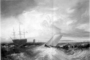 这张作品(见图)就是我最早谈到的——范德比尔得1890年买的那张作品。这张作品是特纳创作的。特纳何许人也?他是19世纪英国最著名的画家,他对光的研究和印象派并驾齐驱,印象派受到了特纳的影响。如果大家看他这幅画的水和天光云影,尤其这个云影比古典派更写意一点,没有古典画派那么精细,但是他把那个气势画出来了,特别是海水的气势,我认为画得相当逼真,动感非常强烈。特纳1851年去世,他早于印象派差不多20年。