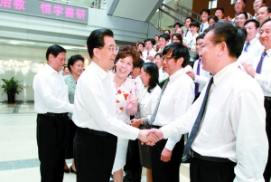 在第二十七个教师节即将到来之际,中共中央总书记、国家主席、中央军委主席胡锦涛9日上午来到北京市第八十中学,亲切看望师生员工,实地考察学校工作,代表党中央向全国广大教师和教育工作者致以节日的祝贺和诚挚的慰问,希望广大教师以对国家、对人民高度负责的精神,加强师德修养,钻研教学业务,不断开拓创新,扎实做好教书育人工作,努力培养社会主义建设者和接班人。(新华社)