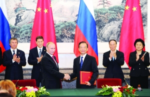 俄罗斯总理普京11日中午抵达北京,开始对中国进行为期2天的正式访问。图为温家宝同普京在北京人民大会堂举行会晤后共同出席有关合作文件的签字仪式。 新华社 图