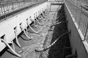 “这些管子里装的就是PVDF膜。通过膜分离后,污水中的污泥被留在外面,洁净水则被抽出。另外,有部分管道是用来向池中打入压缩空气,为的是让膜丝充分摆动。”李万意说,“如果不摆动的话,则膜丝很快就会被污泥堵塞。”