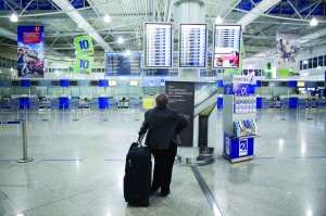 图为一名乘客在雅典国际机场查看信息,受罢工影响,雅典机场航班全部取消。本报传真图