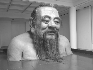 对这样的作品,展览主办方给出了简洁的说明,比如孔子的胸像置于一个大水池中,似乎以此象征孔子在中国千年历史上不断沉浮的命运。又比如那一段古木中的白蚁,则可作为等级森严规矩林立的“白蚁社会”的写照,随着古木的空心化,似乎表明了艺术家对这种封闭社会的前途的忧虑。
