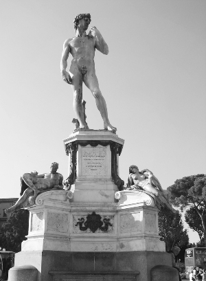 《圣经》中的大卫是一个牧羊少年,因为以弱小的身躯战胜了巨人歌利亚而为人们所纪念和传颂。米开朗基罗的大卫则是一个伟岸的青年,全身赤裸,目光警觉,肌肉紧绷,与《圣经》中的柔弱少年形象全然不符。然而,恰恰是因为这不同寻常的形象与姿态,使得这座雕塑迅速成为佛罗伦萨保卫公民自由的完美象征。大卫所表现出的英雄气质,对于受到周边国家与美第奇家族霸权威胁的佛罗伦萨而言,正是众多市民心目中的渴盼与向往。于是,佛罗伦萨以拥有米开朗基罗而自豪,以拥有《大卫》而自豪。